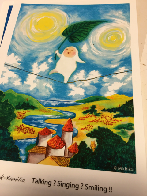 Smiling Posted 2016年3月5日 by tomoko Tink-kamilia(ティンクカミリア)お気に入りのポストカード Talking? Singing? Smiling♪ ご機嫌な綱渡りをする Michikoさんの描く Tink-kamilia(ティンクカミリア) 心Smileになる一枚 We love Sky☆