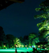 ライトに照らされた芝生と木々。