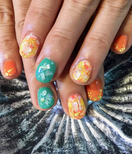 Hands Posted 2018年8月27日 by tomoko NAILネイリストのAYAさんが選んでくれたオレンジ×グリーンネイル。指先がカラフルだと気分もPOPに^^これがありがたい。手は案外自分自身で見ることも多い場所なので、ネイルに気に入った色やデザインがされているのはだいじだなーと思う。 秋は何色にしようか…。そんなことを考えている時間も楽しい。