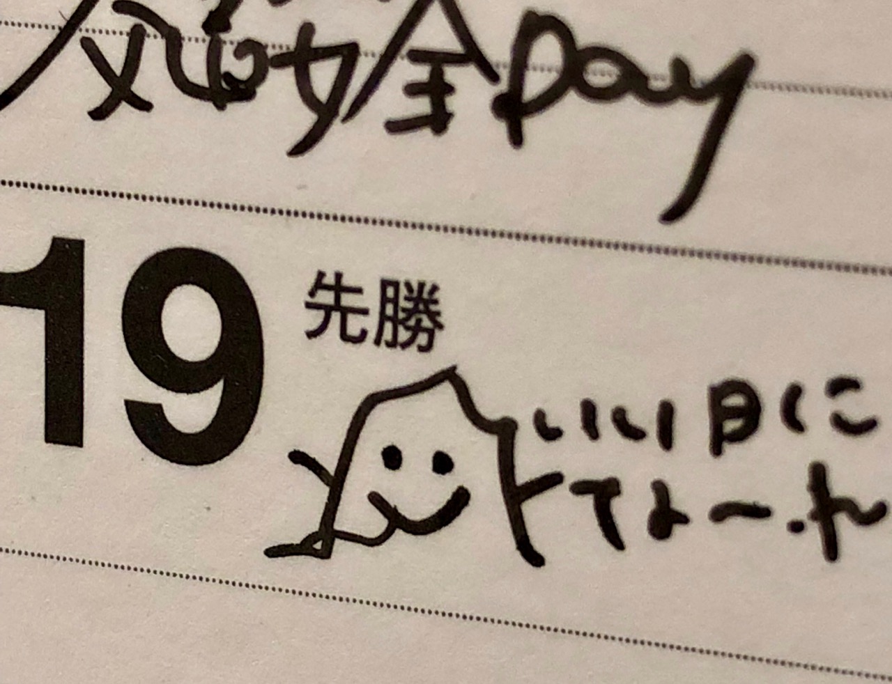 今日のカレンダー。イラストと「いい日になーれ」が描かれている。なんだこれ??記憶を辿ると、数ヶ月前に予定を書き込んでいたとき、うっかり間違えて予定を書き入れてしまった物をイラストに書き変えたことを思い出した^^悪くないかも。