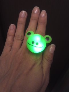 RING Posted 2014年9月24日 by tomoko 子供のころを思い出した。 懐かしい家と、懐かしい道…。 週末からのお祭りモード、縁日にも行ったせいかな? 懐かし~い気持ちが今日になって胸をめぐります。 いろんな出店に心躍った子供時代。 くじ引きや風船すくい、おもちゃを見てワクワクしたっけ。 今も…やっぱり縁日は楽しいね。ワクワクします。 最近は出店でもキラキラ光るおもちゃが多い。 …ということで今日はこの指輪がしたくなった。 キラキラMyカエルリング♪ ファンの方からプレゼントでもらった。 ありがとう。
