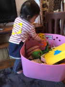 背中にはパパがいたずらで貼ったシールの縁も。
