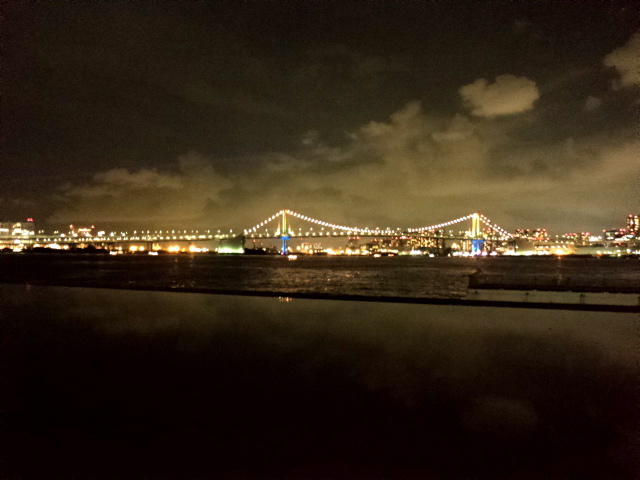 Tokyo Posted 2013年9月14日 by tomoko TOKYOレインボーブリッジにお台場 右手には東京タワーと街の光 空には月が見えた。 今夜晴海埠頭からの景色。 景色とMusicに感動 幸せな土曜の夜です^^
