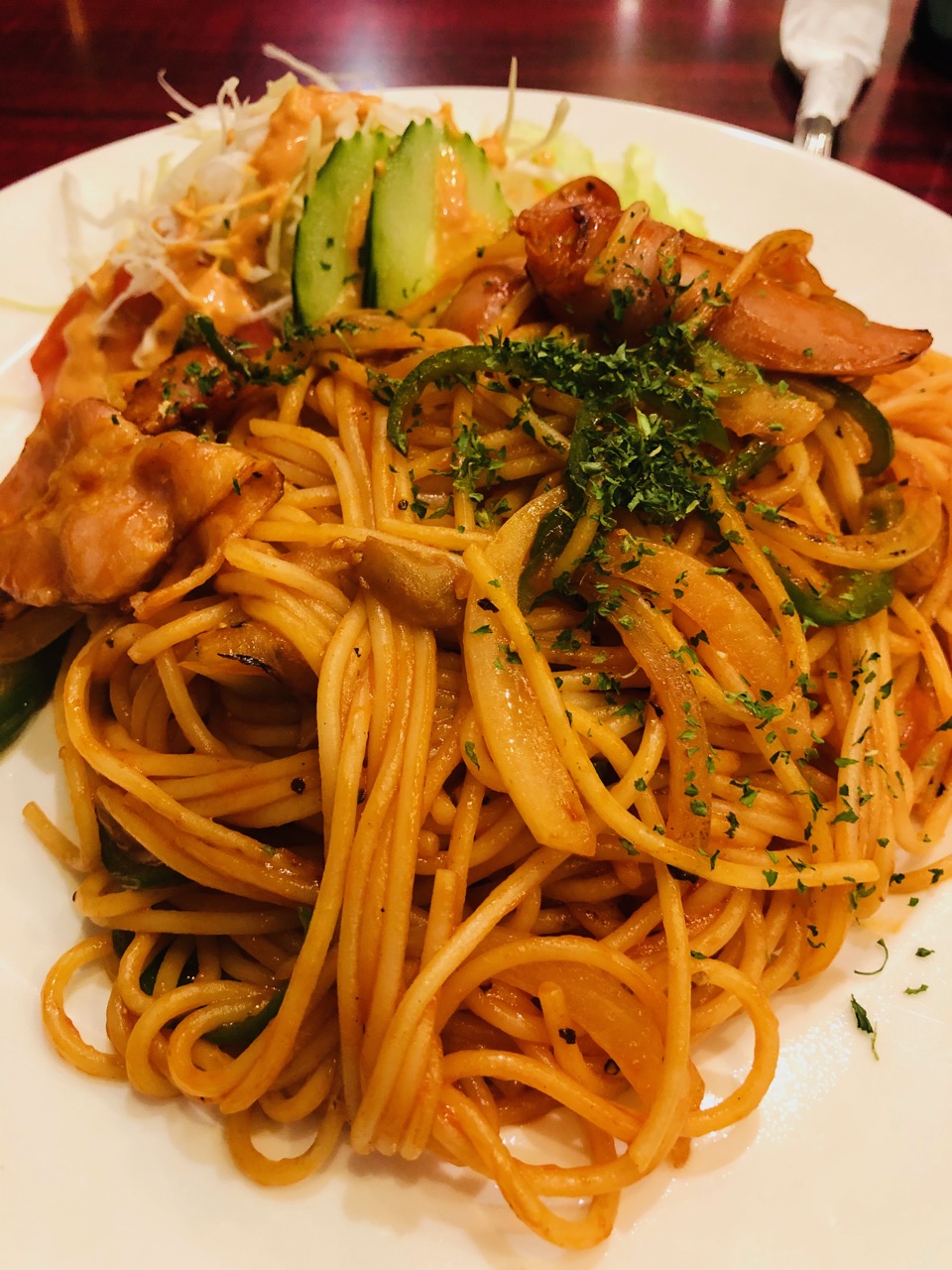 メニューを見て「ナポリタン」のことだとわかった。ケチャップの焼けたいい香りと200g以上はあるボリュームたっぷりのナポリタン。とーーーっても美味しかった!リスナーさんの高校時代を想像したり、大好きな雰囲気の喫茶店で、いい時間が過ごせた。感謝。また行きたいな。